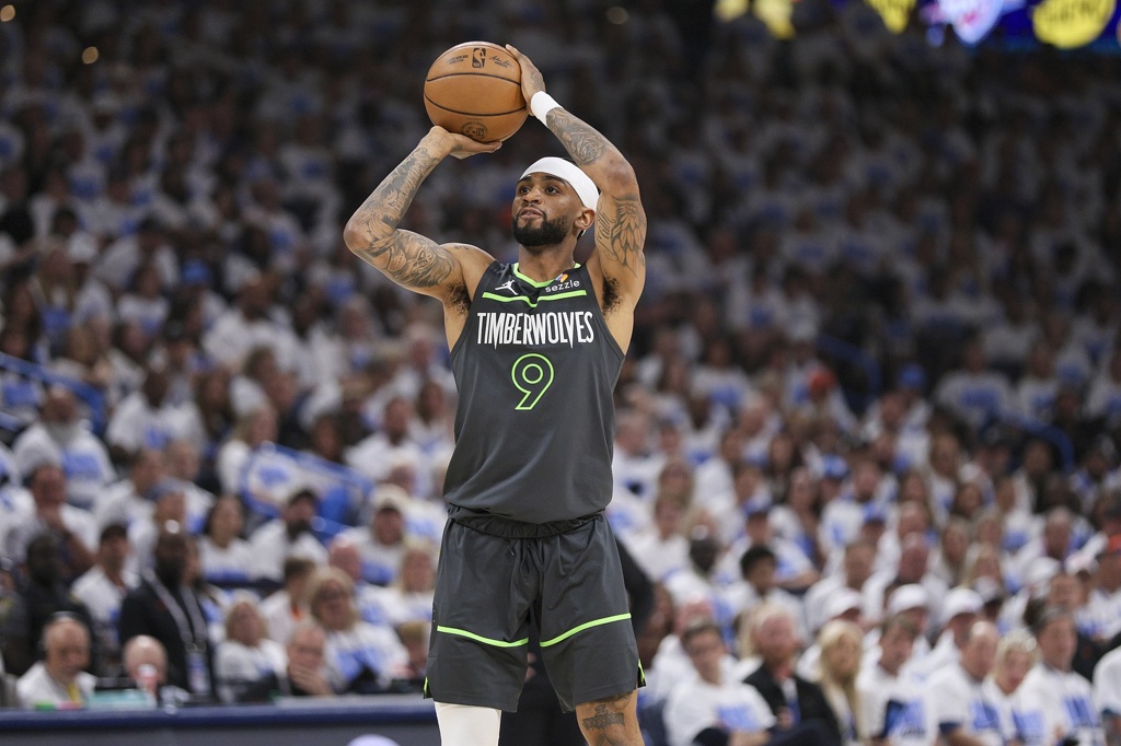 森林狼的外线空间和投射能力显然比掘金更好,除了戈贝尔,8人轮换主体阵容7个点都有三分射程。森林狼上半场领先雷霆的关键是三分球28中10,比雷霆多命中了7记三分,破解雷霆防守的方式简单粗暴,华子/兰德尔吸引夹击后团队转移球空位三分扫射,显然对自己的投射能力十分自信