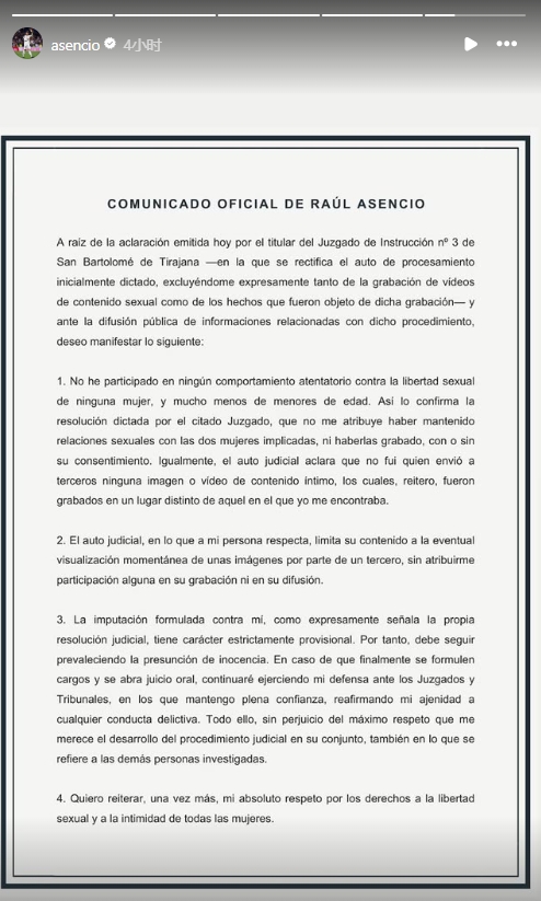 1-我从未参与过任何侵犯女性性自由的行为,更不用说未成年女性。这一点得到了上述法院文书的确认。该文书并未认定我与涉及的两名女性发生过性关系,也未认定我录制了这些视频。同样,还澄清了我没有向第三方发送任何包含私密内容的图像或视频,再次强调,这些视频是在我不在场的地方录制的。