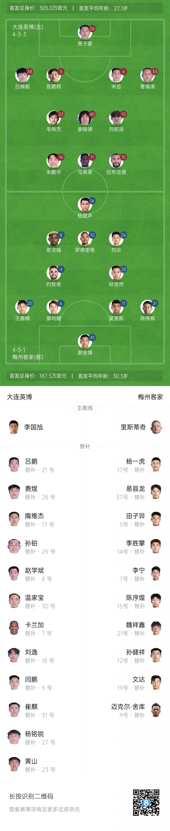 英博vs梅州首发:20岁毛伟杰&朱鹏宇先发,恩戈姆、罗德里格出战